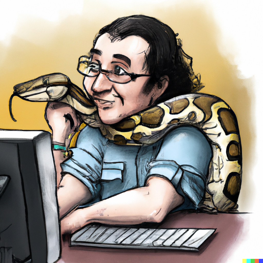 DALL·E 2022-08-11 20.29.59 - A tame happy python cuddling with a happy scientist in front of a computer; Digital art.png