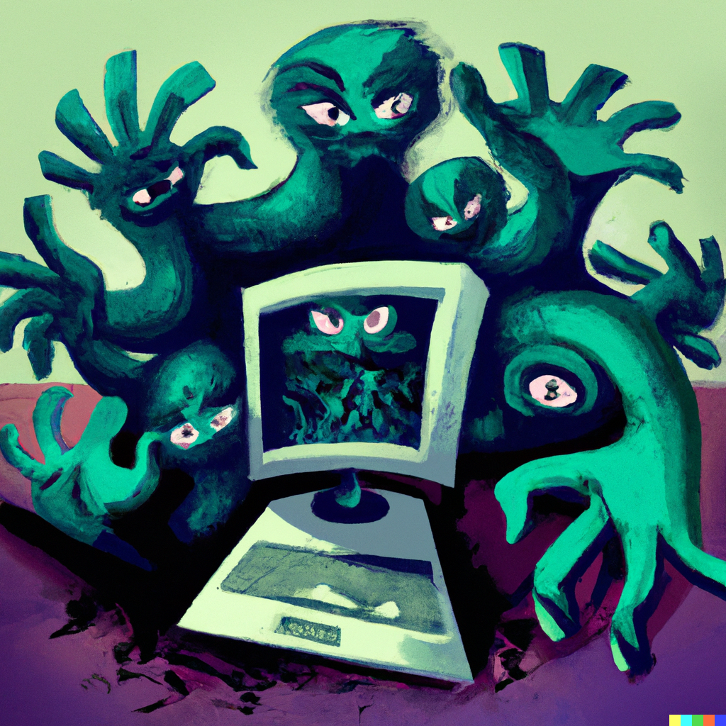 DALL·E 2022-08-11 20.28.12 - An apocalyptic monster with many heads that is destroying a computer. Digital art.png
